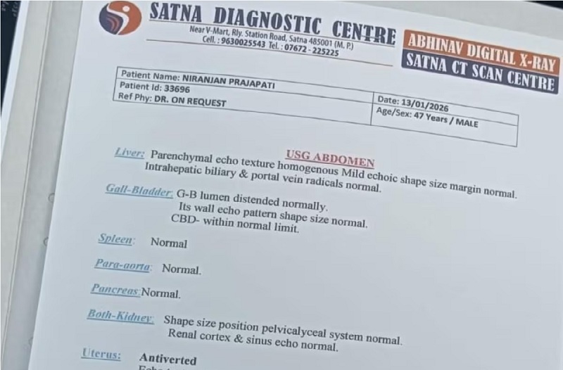 मामला उचेहरा भाजपा के नगर पंचायत के अध्यक्ष 47 साल के निरंजन प्रजापति का है। 13 जनवरी को निरंजन प्रजापति को पेट में तेज दर्द हुआ। वे इलाज और जांच के लिए सतना के स्टेशन रोड स्थित सतना डायग्नोस्टिक सेंटर’ पहुंचे। वहां सेंटर के संचालक डॉ. अरविंद सराफ की देखरेख में उनकी सोनोग्राफी की गई। जब रिपोर्ट हाथ में आई, तो मरीज और उनके परिजन सन्न रह गए।