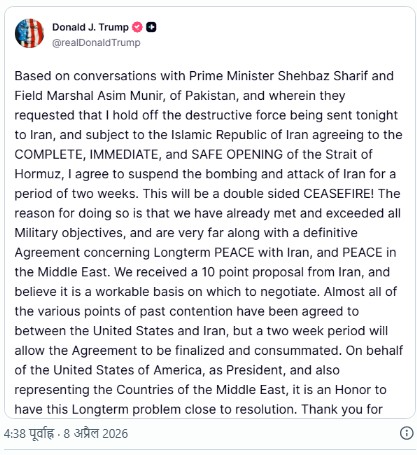 बता दें कि सीजफायर के इस ऐलान से पहले मिडिल ईस्ट में तनाव चरम पर था. ट्रंप ने सोमवार को ईरान के पावर प्लांट और ब्रिज को उड़ाने की धमकी दी थी. मंगलवार को ईरान के ऊपर लगातार हमले हुए. ईरान के लिए सबसे अहम माने जाने वाले खार्ग द्वीप में एक के बाद एक हमले हुए. ट्रंप ने साफ चेतावनी दे दी है कि अगर ईरान समझौता करने या होर्मुज स्ट्रेट खोलने को तैयार नहीं हुआ तो उसका समूल विनाश कर दिया जाएगा.
