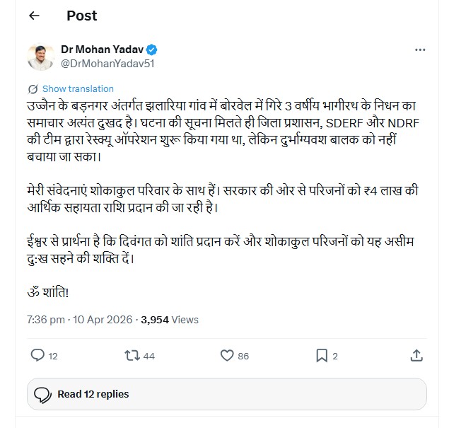 मासूम की मौत पर मुख्यमंत्री डॉ मोहन यादव ने गहरा दुख व्यक्त किया है. साथ ही परिजनों को 4 लाख की आर्थिक सहायता देने का ऐलान किया है. मुख्यमंत्री ने सोशल मीडिाय साइट एक्स पर ट्वीट करके लिखा, ‘उज्जैन के बड़नगर अंतर्गत झलारिया गांव में बोरवेल में गिरे 3 वर्षीय भागीरथ के निधन का समाचार अत्यंत दुखद है. घटना की सूचना मिलते ही जिला प्रशासन, SDERF और NDRF की टीम द्वारा रेस्क्यू ऑपरेशन शुरू किया गया था, लेकिन दुर्भाग्यवश बालक को नहीं बचाया जा सका. मेरी संवेदनाएं शोकाकुल परिवार के साथ हैं. सरकार की ओर से परिजनों को 4 लाख की आर्थिक सहायता राशि प्रदान की जा रही है. ईश्वर से प्रार्थना है कि दिवंगत को शांति प्रदान करें और शोकाकुल परिजनों को यह असीम दु:ख सहने की शक्ति दें. ओम शांति!’