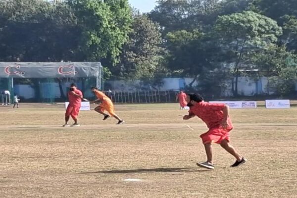 धोती-कुर्ता पहन क्रिकेट के मैदान में उतरे खिलाड़ी, लगाए चतुष्कम्-षठकम्